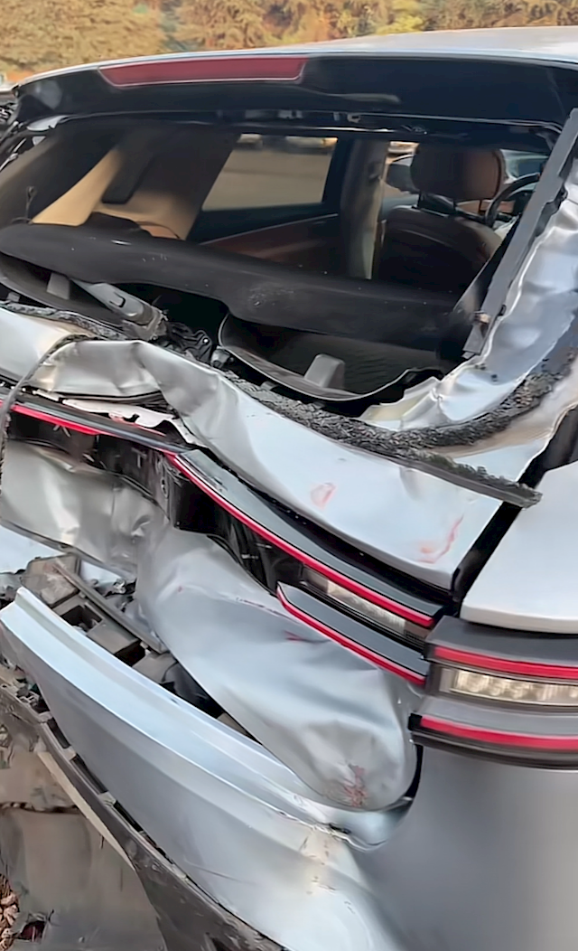 车主本人情绪平稳后自行掏出手机拍摄了事故现场,可以看到M5遭追尾后受损不轻,后挡风玻璃碎裂,保险杠以及尾门塌陷严重,露出了里面厚实的防撞梁。