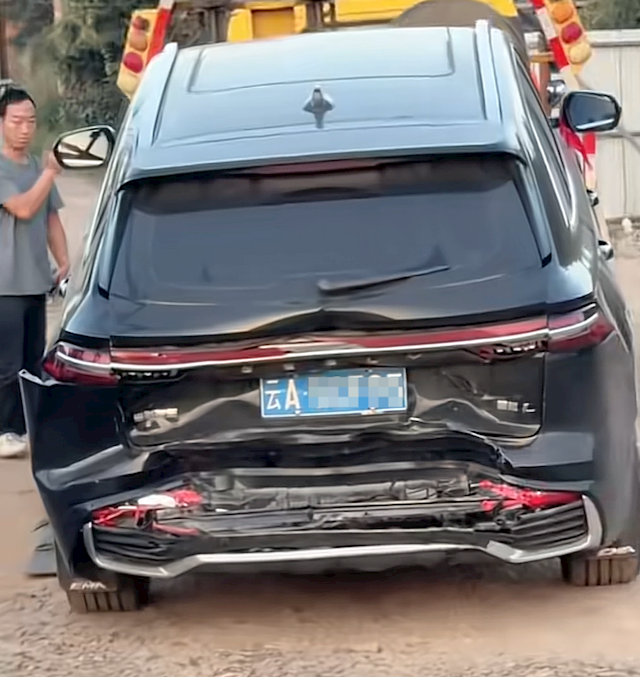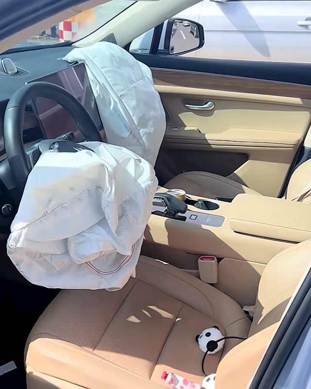 车前受损较轻,但保险杠和前舱盖均有不同程度的碎裂和褶皱,前排安全气囊也均弹出,被追尾的星越L尾部同样受损严重,可见当时冲击力有多大。