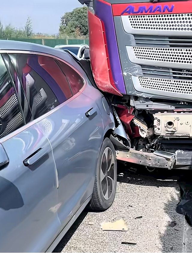 当时他们一行5人驾车行驶,前方突然出现拥堵,于是减速跟车,然而后方一辆重达32吨的货车由于刹不住车,撞到了这M5尾部,并推着它撞击前方一辆吉利星越L。