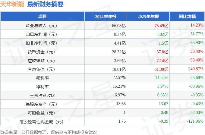 据证券之星公开数据整理,近期天华新能(300390)发布2025年年报。截至本报告期末,公司营业总收入75.49亿元,同比上升14.23%,归母净利润4.02亿元,同比下降51.77%。按单季度数据看,第四季度营业总收入19.78亿元,同比上升71.18%,第四季度归母净利润3.69亿元,同比上升512.79%。本报告期天华新能应收账款上升,应收账款同比增幅达93.4%。